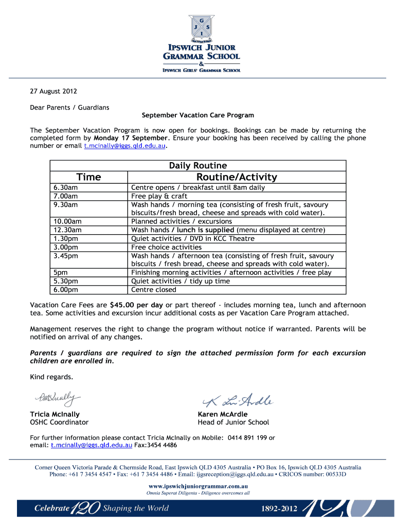 27 August 2012 Dear Parents / Guardians September Vacation Care Program The September Vacation Program is now open for bookings. Bookings can be made by returning the completed form by Monday 17 September.
