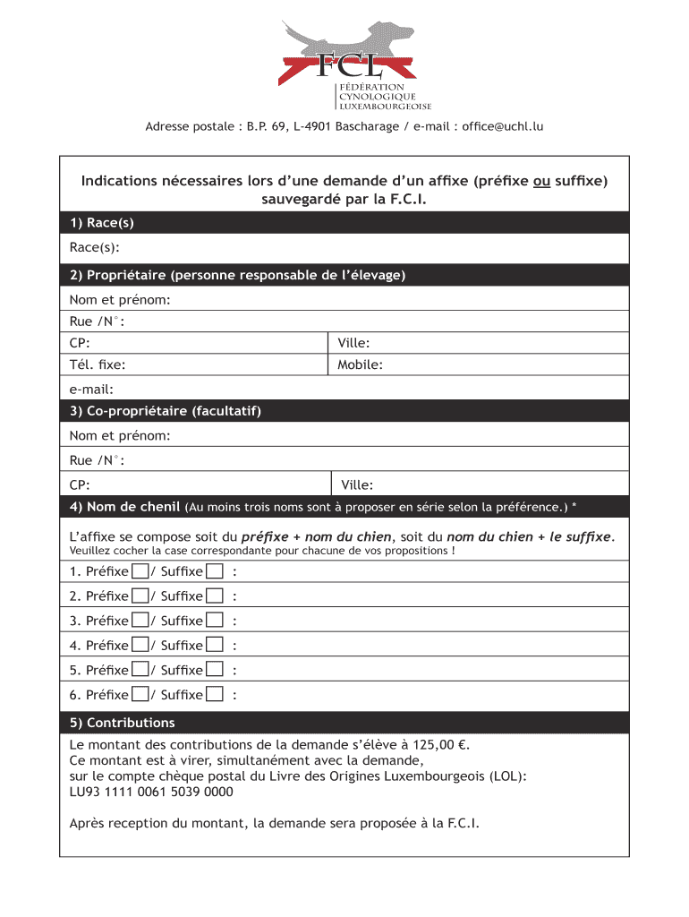 FCL Formation cynologique Luxembourgers Address postal : B.P. 69, L4901 Discharge / email : office UCL.LU Indications necessaries loss dune demand dun affine (price of suffix) safeguard par la F.C.I.