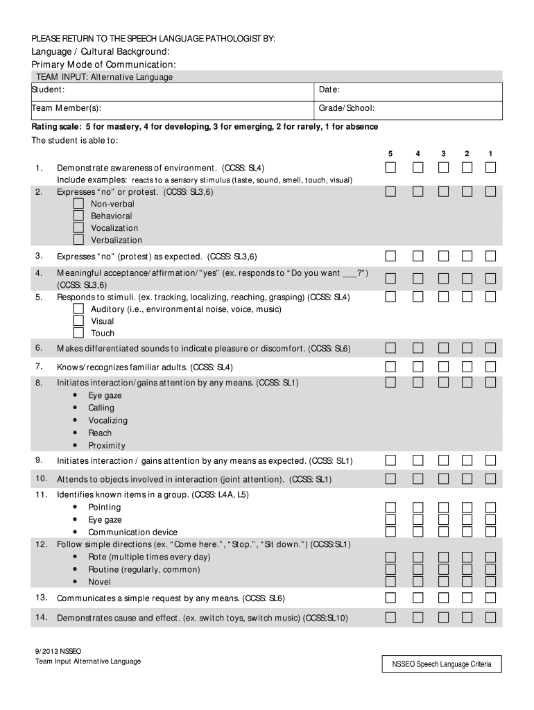 PLEASE RETURN TO THE SPEECH LANGUAGE PATHOLOGIST BY: Language / Cultural Background: Primary Mode of Communication: TEAM INPUT: Alternative Language Student: Date: Team Member(s): Grade/School: Rating