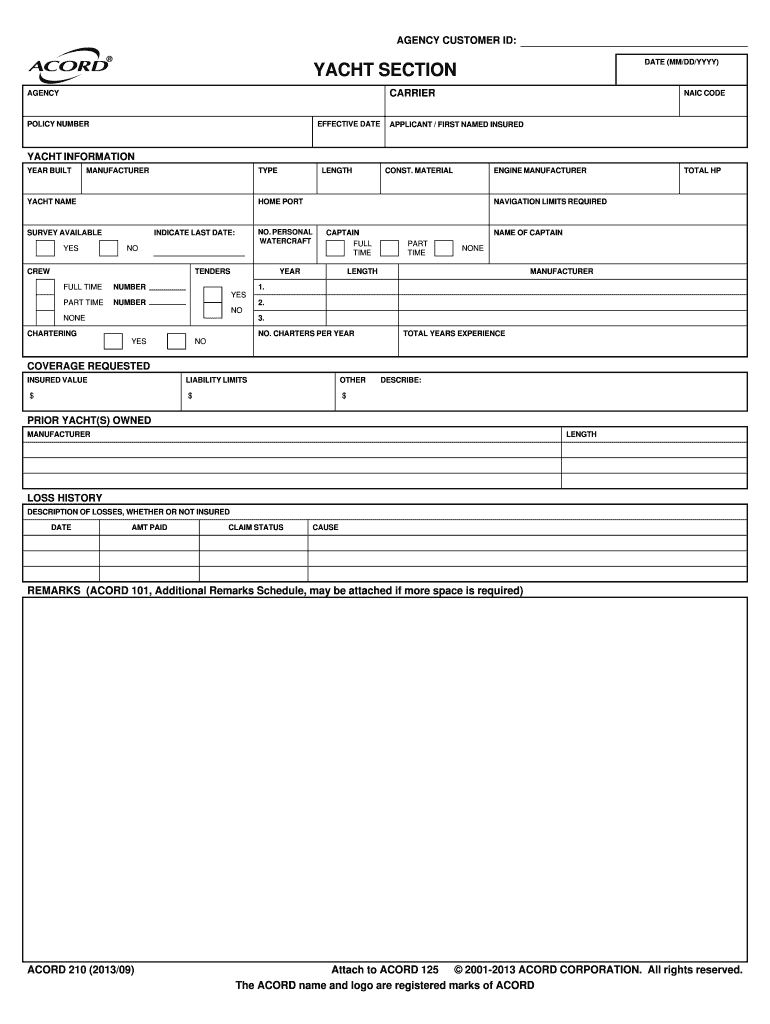 AGENCY CUSTOMER ID: DATE (MM/DD/YYY)YACHT SECTION CARRIERAGENCYPOLICY NUMBEREFFECTIVE DIATONIC CODEAPPLICANT / FIRST NAMED INSUREDYACHT INFORMATION YEAR BUILTMANUFACTURERTYPEYACHT NAMECONST. MATERIALENGINE