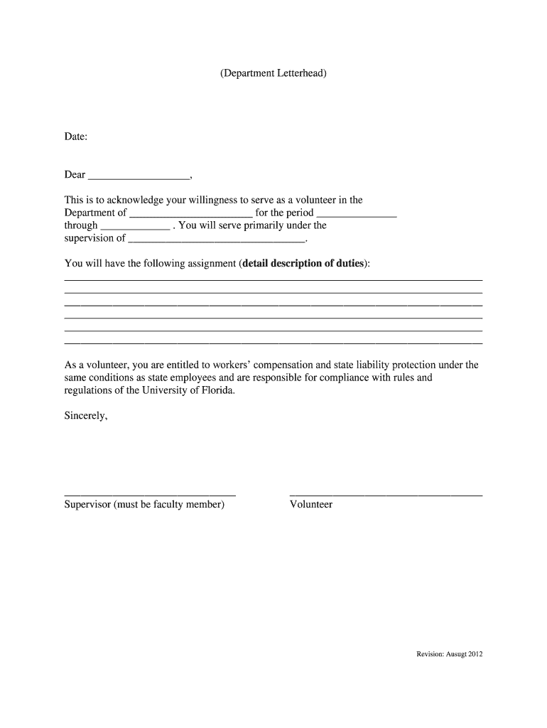 (Department Letterhead) Date: Dear, This is to acknowledge your willingness to serve as a volunteer in the Department of for the period through. You will serve primarily under the supervision of.