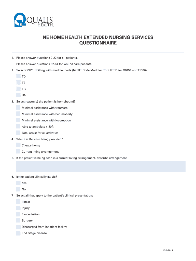 NE HOME HEALTH EXTENDED NURSING SERVICES QUESTIONNAIRE 1. Please answer questions 222 for all patients. Please answer questions 5264 for wound care patients. 2. Select ONLY if billing with modifier