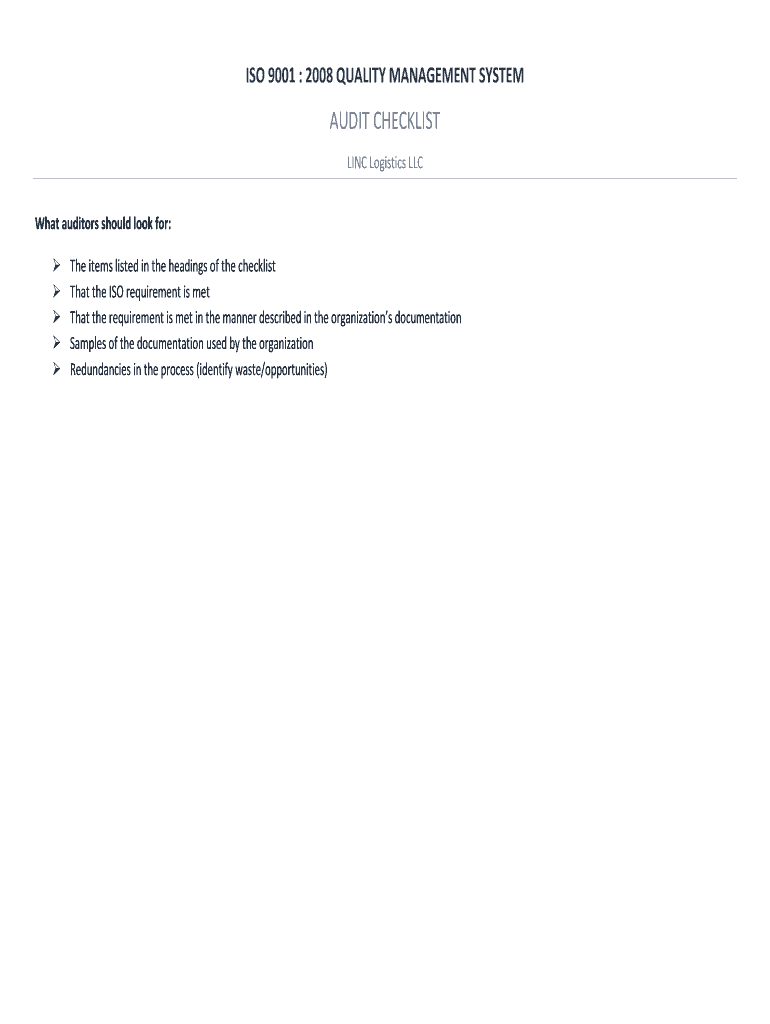 ISO 9001 : 2008 QUALITY MANAGEMENT SYSTEMATIC CHECKLIST LINE Logistics LLC What auditors should look for: The items listed in the headings of the checklist That the ISO requirement is met That the