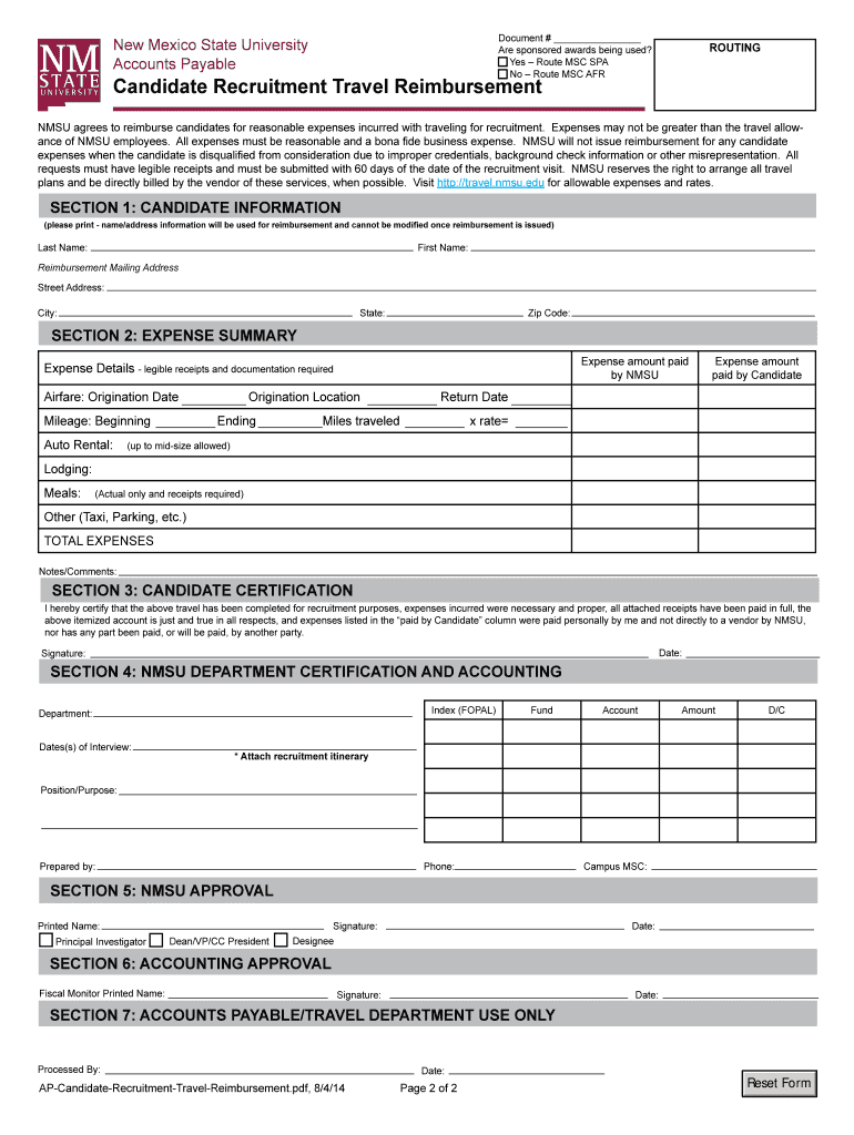 New Mexico State University Accounts Payable Candidate Recruitment Travel Reimbursement The Candidate Recruitment Travel Reimbursement form is to be used only for reimbursement of travel expenses