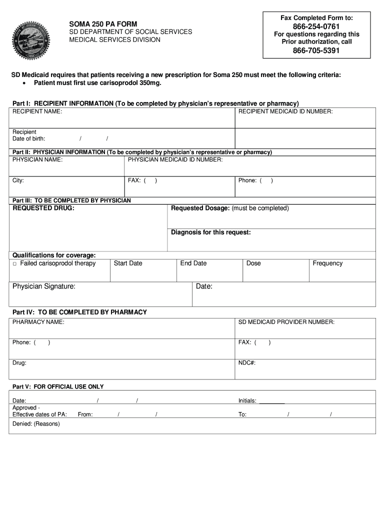SOMA 250 PA FORM SD DEPARTMENT OF SOCIAL SERVICES. MEDICAL SERVICES DIVISION. Fax Completed Form to: 8662540761. For questions regarding this. Prior ...