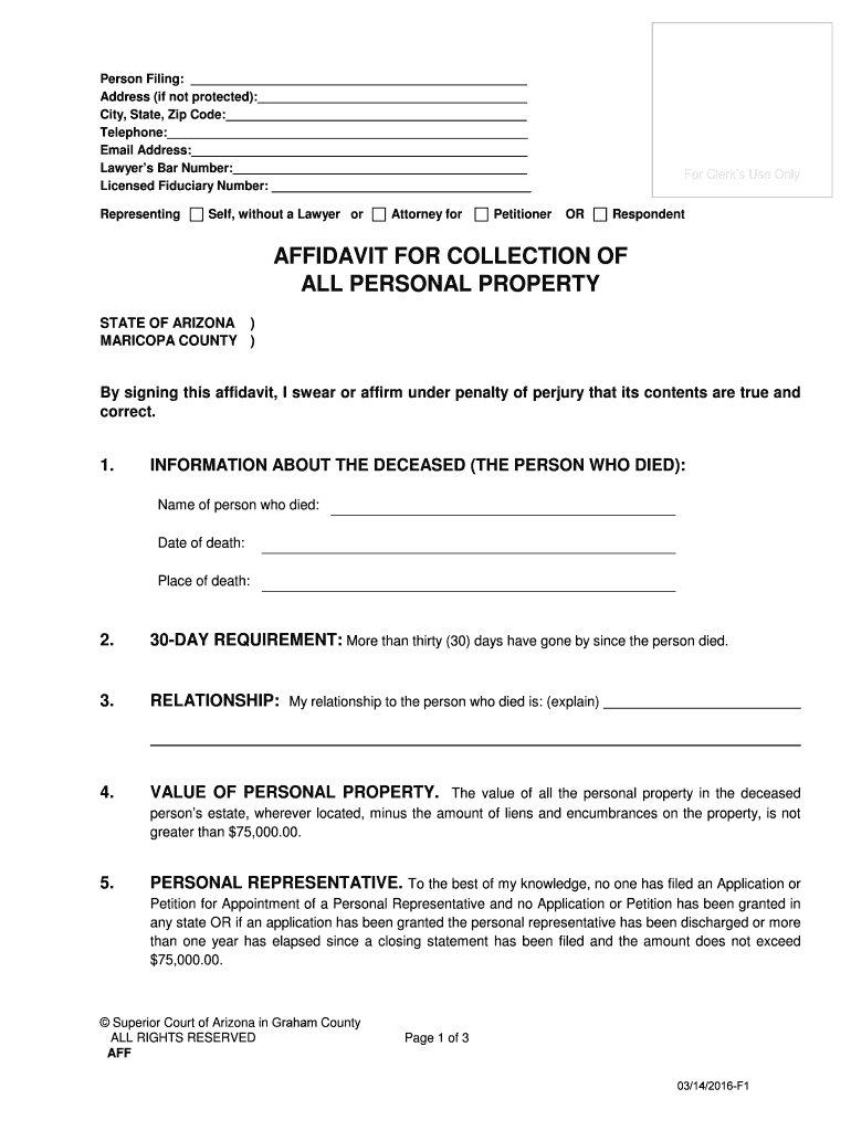 F1 SMALL ESTATE AFFIDAVIT 1 For Transfer of Property When a Person has Died FORMS and INSTRUCTIONS Superior Court of Arizona in Graham County ALL RIGHTS RESERVED PBSE1 5280 082514 09/17/2015F1 03/14/2016F1
