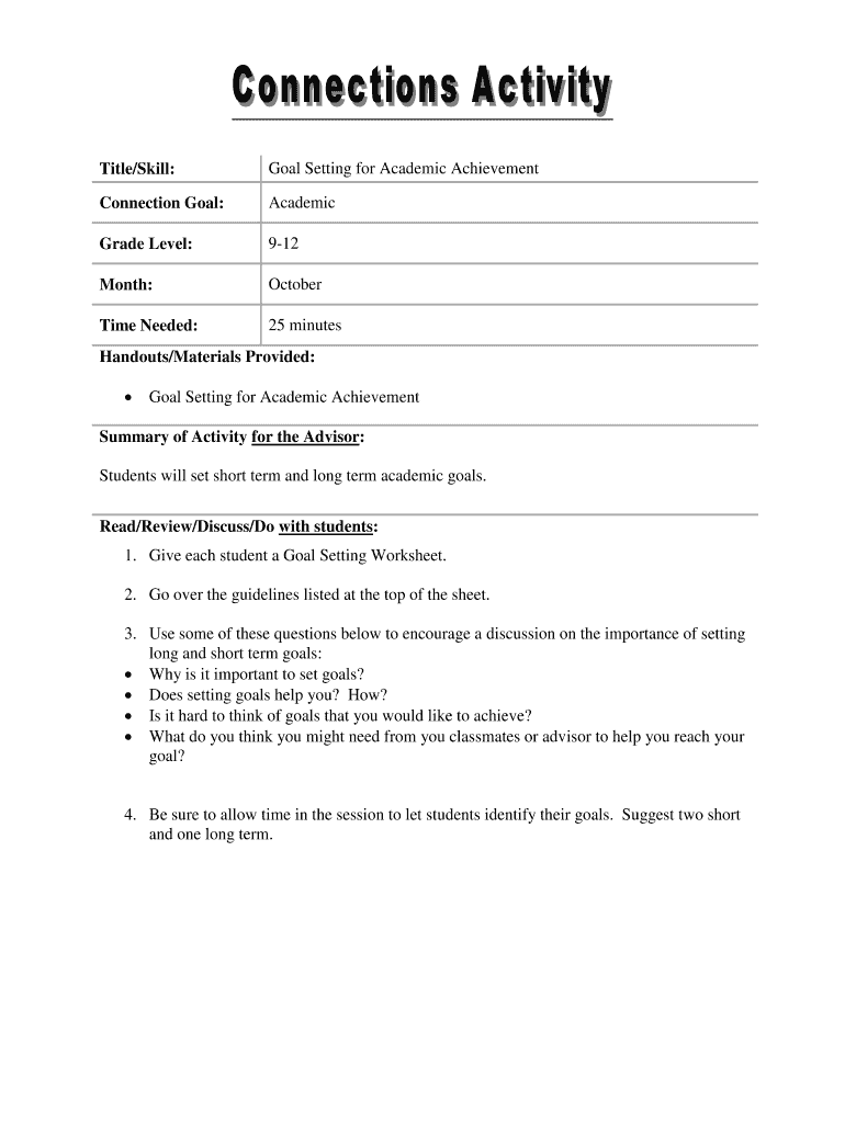 Title/Skill:Goal Setting for Academic AchievementConnection Goal:AcademicGrade Level:912Month:OctoberTime Needed:25 minutesHandouts/Materials Provided: