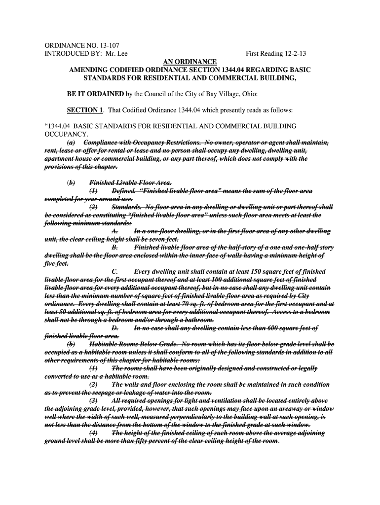 ORDINANCE NO. 13107 INTRODUCED BY: Mr. Lee First Reading 12213 AN ORDINANCE AMENDING CODIFIED ORDINANCE SECTION 1344.04 REGARDING BASIC STANDARDS FOR RESIDENTIAL AND COMMERCIAL BUILDING, BE IT ORDAINED