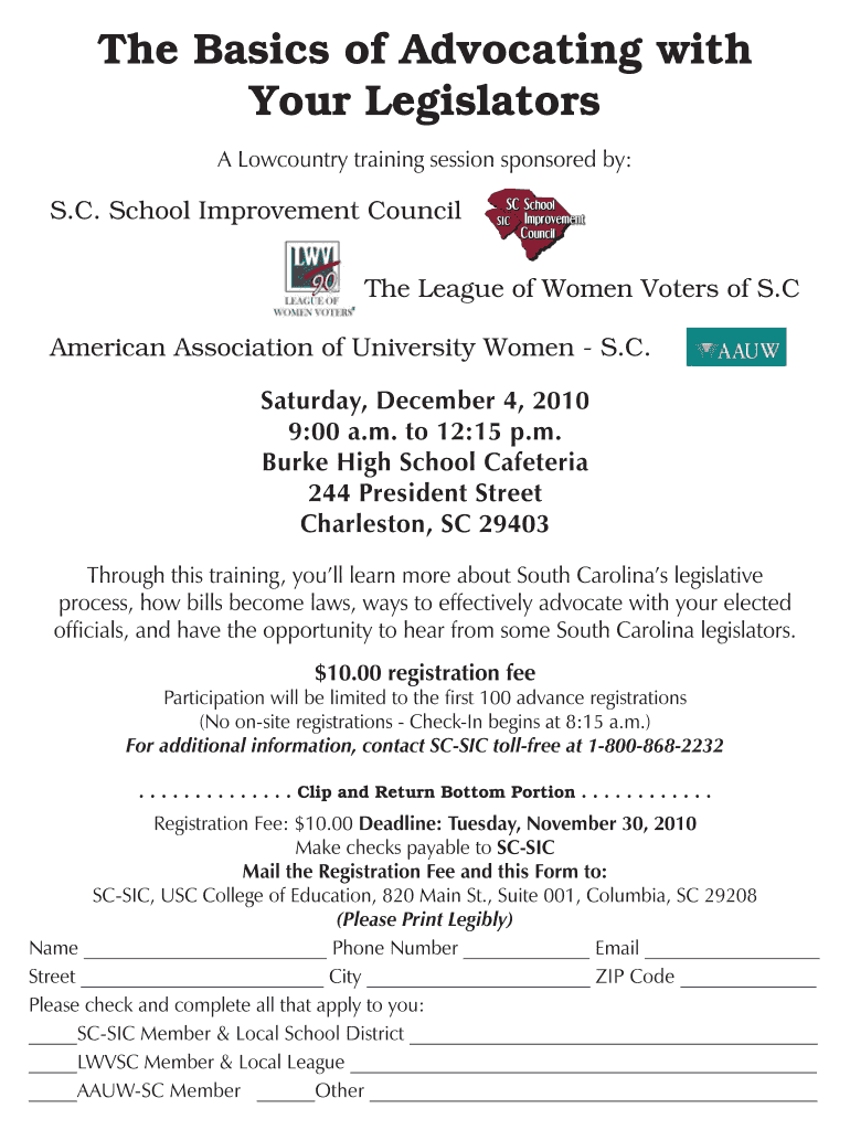 The Basics of Advocating with Your Legislators A Low country training session sponsored by: S.C. School Improvement Council The League of Women Voters of S. C American Association of University Women