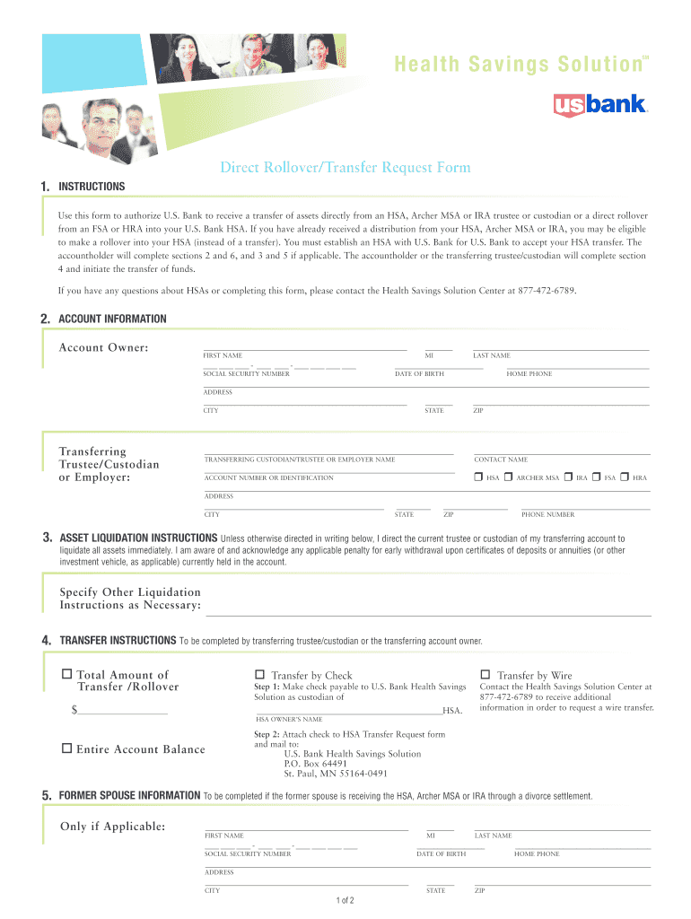 Health Savings Solution SM Direct Rollover/Transfer Request Form 1. INSTRUCTIONS Use this form to authorize U.S. Bank to receive a transfer of assets directly from an HSA, Archer MSA or IRA trustee