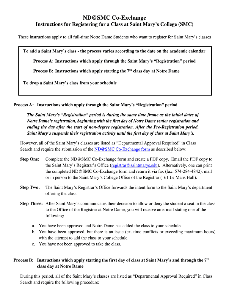 ND SMC Exchange Instructions for Registering for a Class at Saint Mary's College (SMC) These instructions apply to all full time Notre Dame Students who want to register for Saint Mary's classes To