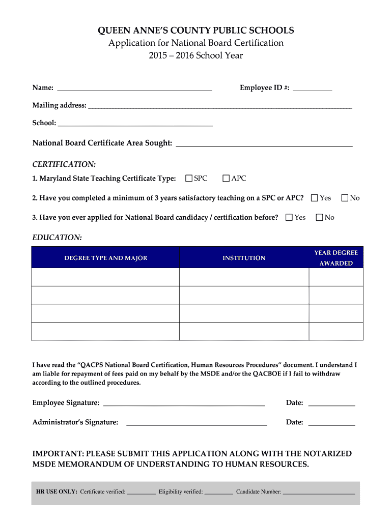 QUEEN ANNE COUNTY PUBLIC SCHOOLS Application for National Board Certification 2015 2016 School Year Name: Employee ID #: Mailing address: School: National Board Certificate Area Sought: CERTIFICATION: