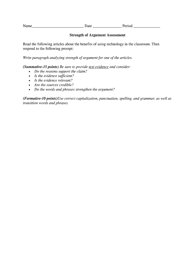 Name Date Period Strength of Argument Assessment Read the following articles about the benefits of using technology in the classroom. Then respond to the following prompt: Write paragraph analyzing