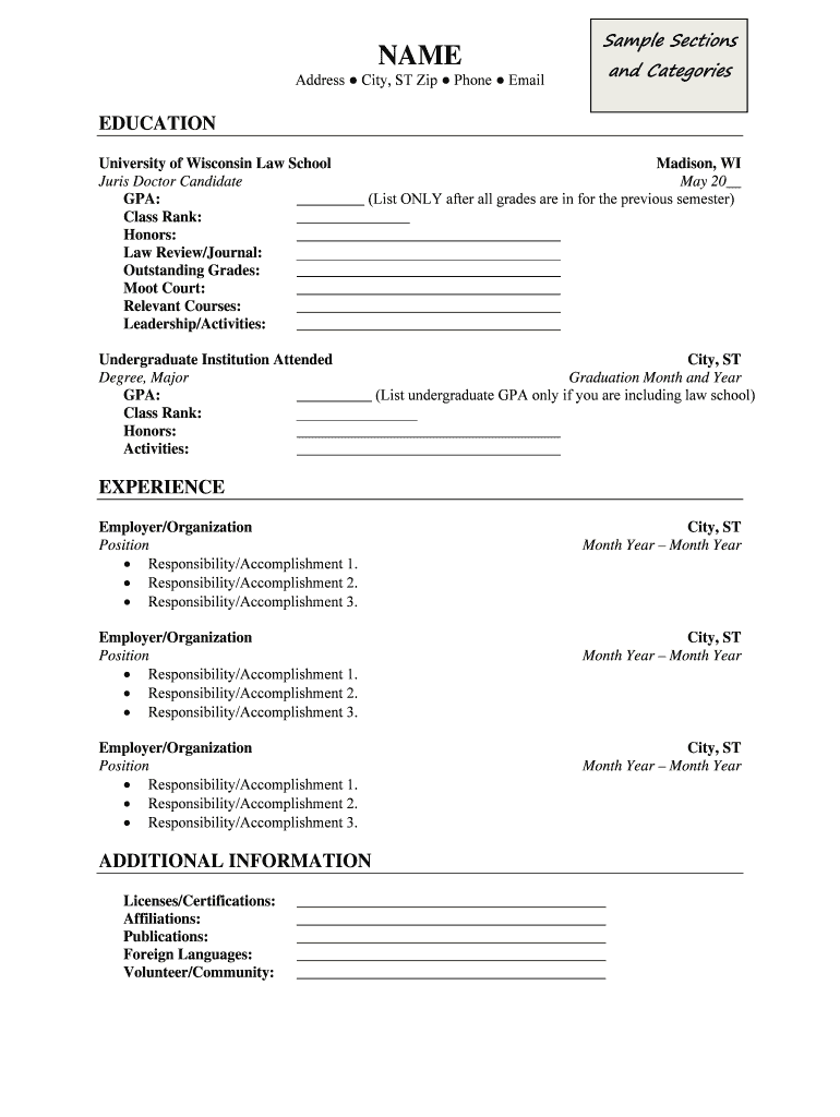 NAME Sample Sections and Categories Address City, ST Zip Phone Email EDUCATION University of Wisconsin Law School Madison, WI Juries Doctor Candidate May 20 GPA: (List ONLY after all grades are in