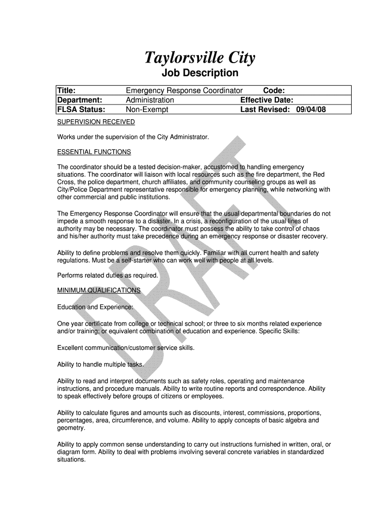 This document outlines the job description for the Emergency Response Coordinator position, detailing essential functions, qualifications, work environment, and supervision.