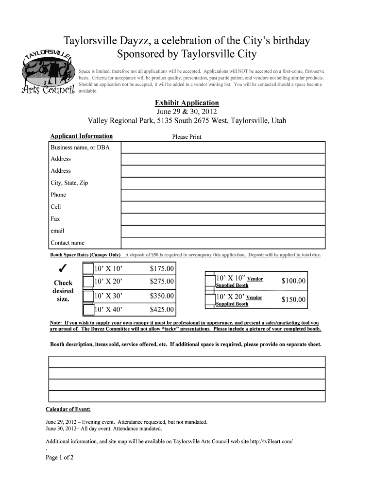 This document is an application form for vendors wishing to participate in the Taylorsville Dayzz celebration, detailing booth space rates, terms and conditions for participation, and requirements
