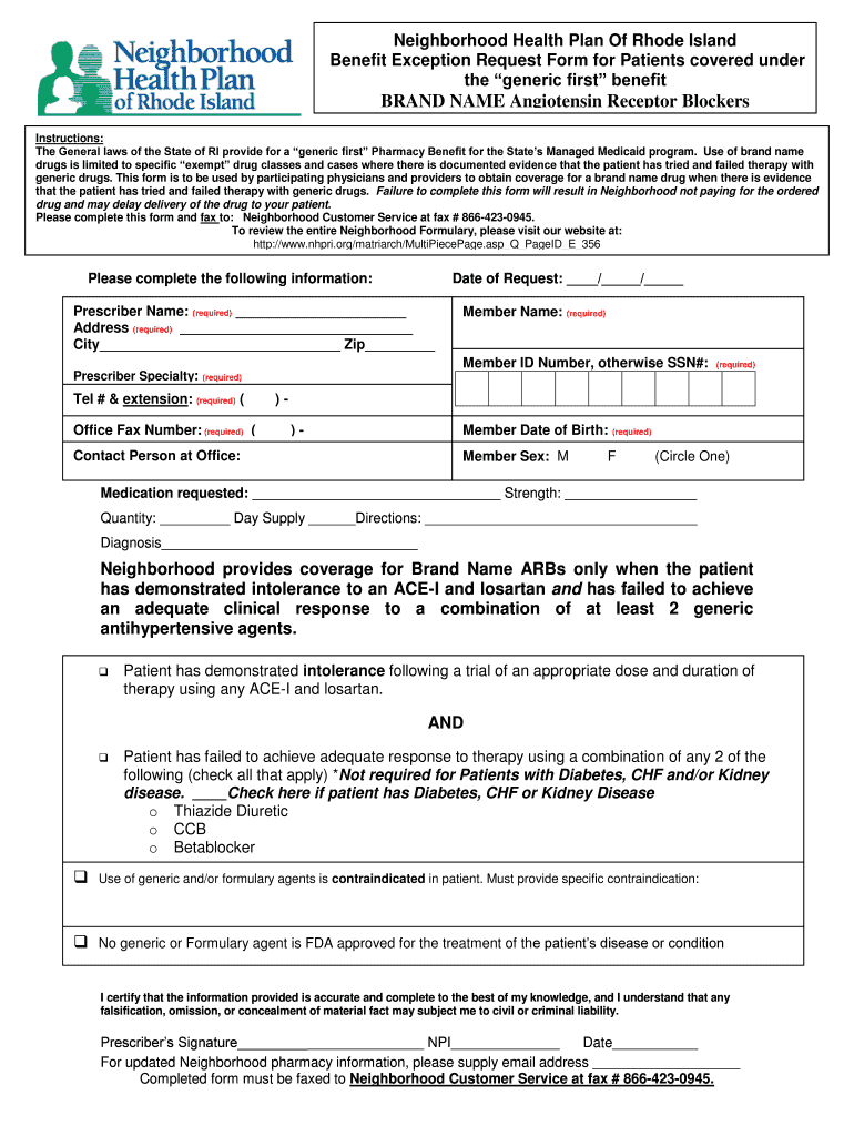 Neighborhood Health Plan Of Rhode Island Benefit Exception Request Form for Patients covered under the generic first benefit BRAND NAME Angiotensin Receptor Blockers Instructions: The General laws