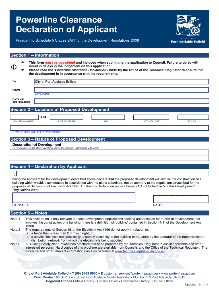 Power line Clearance Declaration of Applicant Pursuant to Schedule 5 Clause 2A(1) of the Development Regulations 2008 Section 1 Information This form must be completed and included when submitting