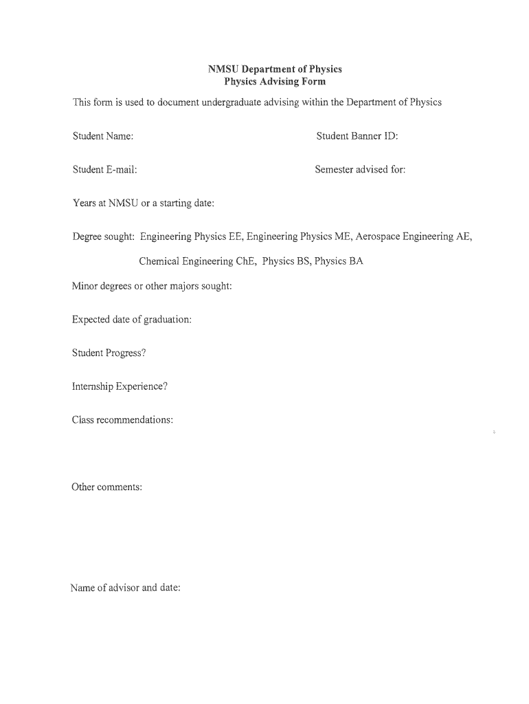 MSU Department of Physics Advising Form This form is used to document undergraduate advising within the Department of Physics Student Name: