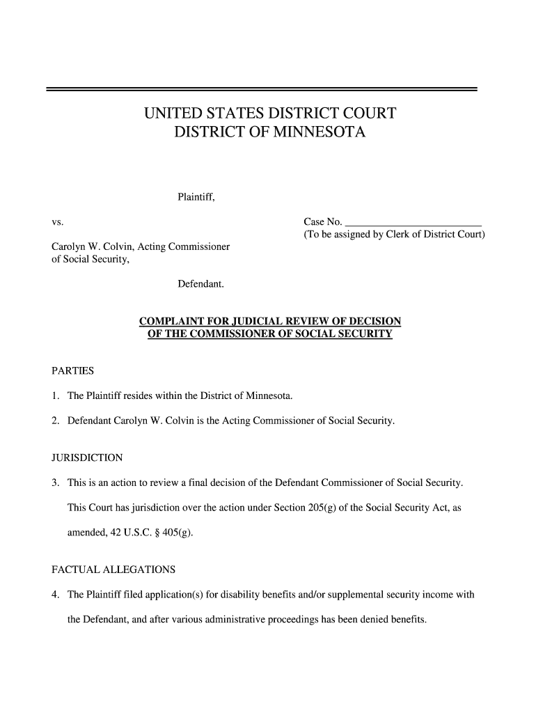 UNITED STATES DISTRICT COURT DISTRICT OF MINNESOTA Plaintiff, vs. Case No. (To be assigned by Clerk of District Court) Carolyn W. Colvin, Acting Commissioner of Social Security, Defendant. COMPLAINT