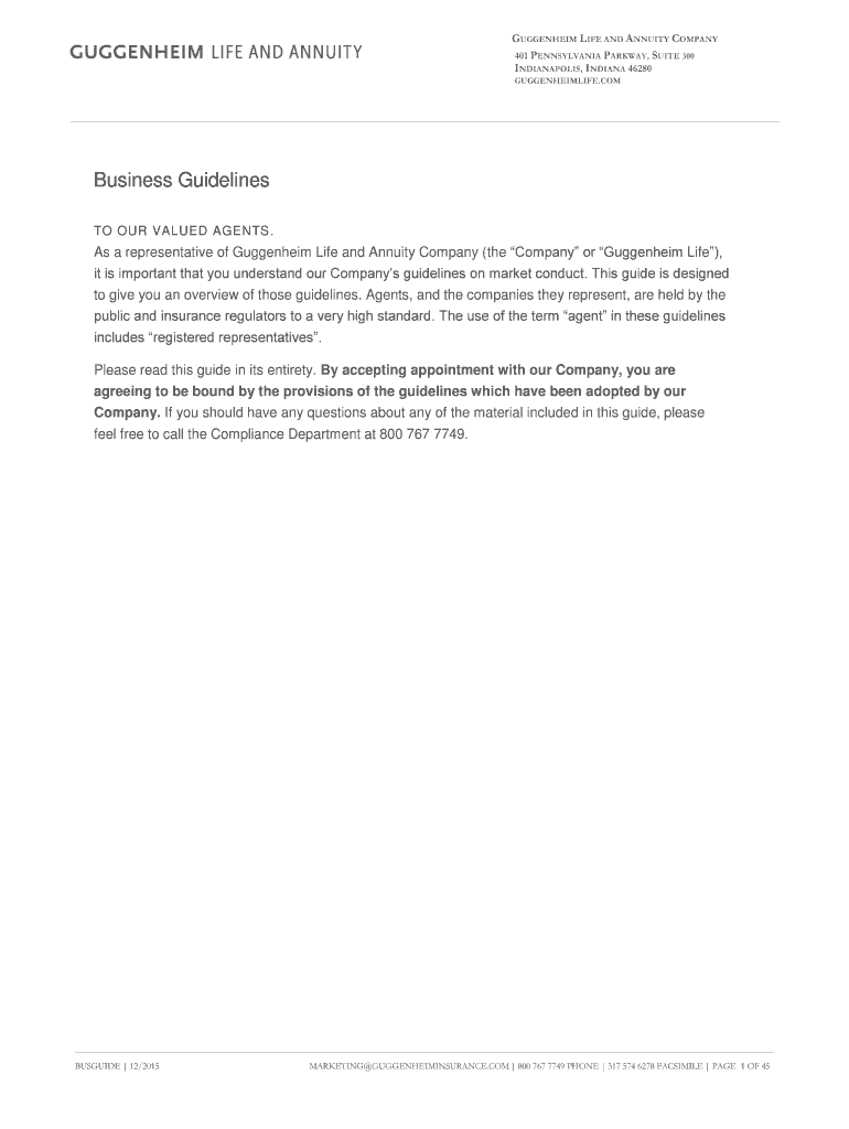 GUGGENHEIM LIFE AND ANNUITY COMPANY 401 PENNSYLVANIA PARKWAY, SUITE 300 INDIANAPOLIS, INDIANA 46280 GUGGENHEIMLIFE.COM Business Guidelines TO OUR VALUED AGENTS. As a representative of Guggenheim Life