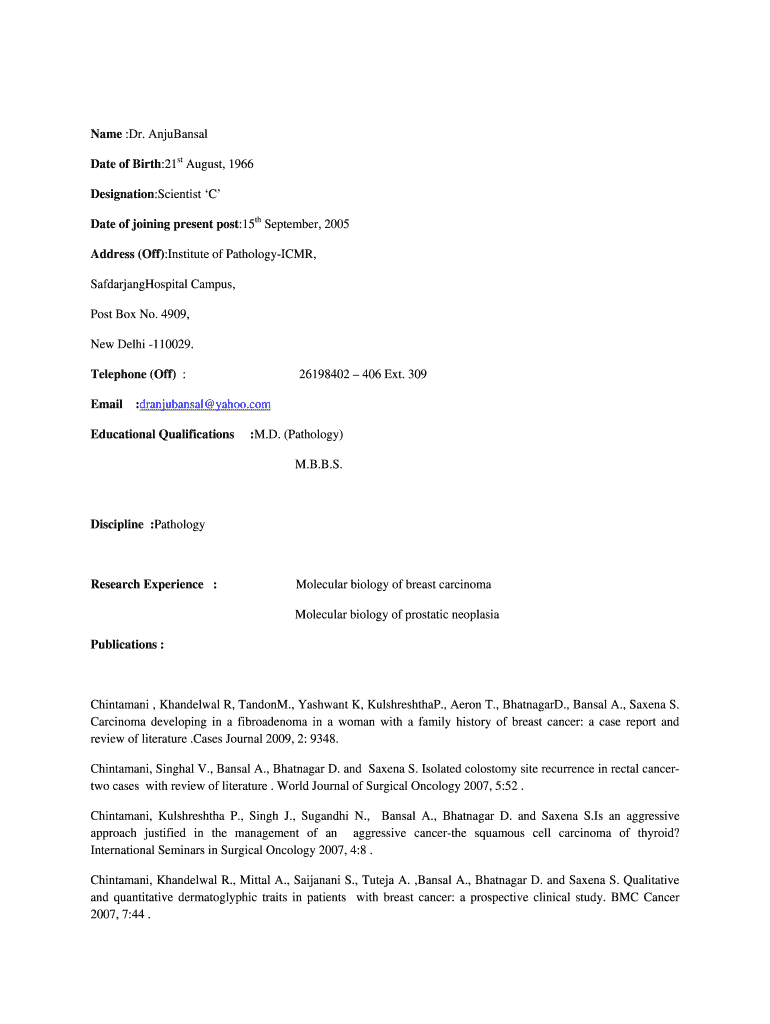Name :Dr. AnjuBansal Date of Birth:21st August 1966 Designation:Scientist C Date of joining present post:15th September 2005 Address (Off):Institute of Pathological, SafdarjangHospital Campus, Post
