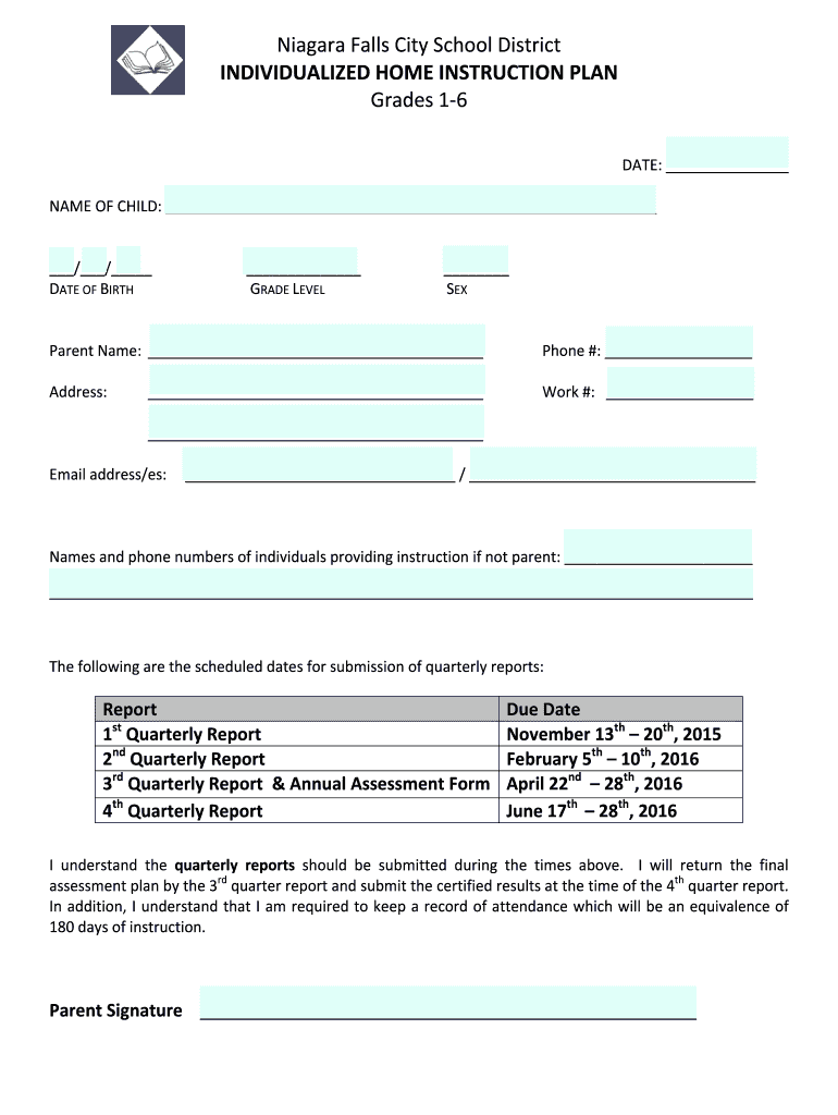 Niagara Falls City School District INDIVIDUALIZED HOME INSTRUCTION PLAN Grades 16 DATE: NAME OF CHILD: / / DATE OF BIRTH GRADE LEVEL SEX Parent Name: Phone #: Address: Work #: Email address/BS: /