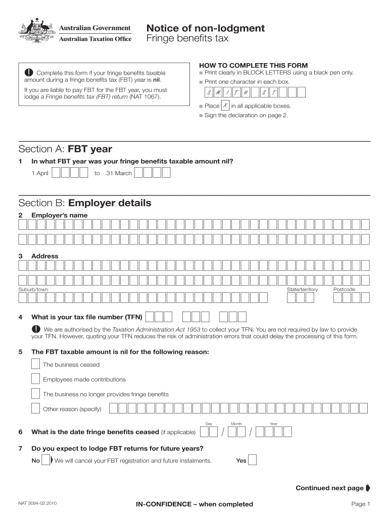Notice of nonlodgment Fringe benefits tax HOW TO COMPLETE THIS FORM Complete this form if your fringe benefits taxable amount during a fringe benefits tax (FBI) year is nil. If you are liable to pay