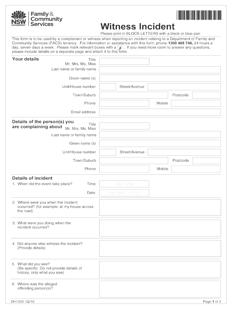 DH1028 - witness incident form can be filled out by providing details of the incident witnessed.