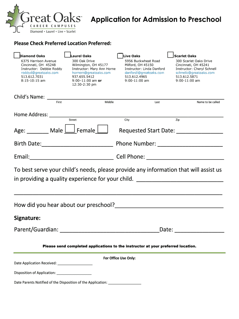 Application for Admission to Preschool Please Check Preferred Location Preferred: Diamond Oaks Laurel Oaks 6375 Harrison Avenue Cincinnati, OH 45248 Instructor: Debbie Rowdy greatoaks.com 513.612.7031