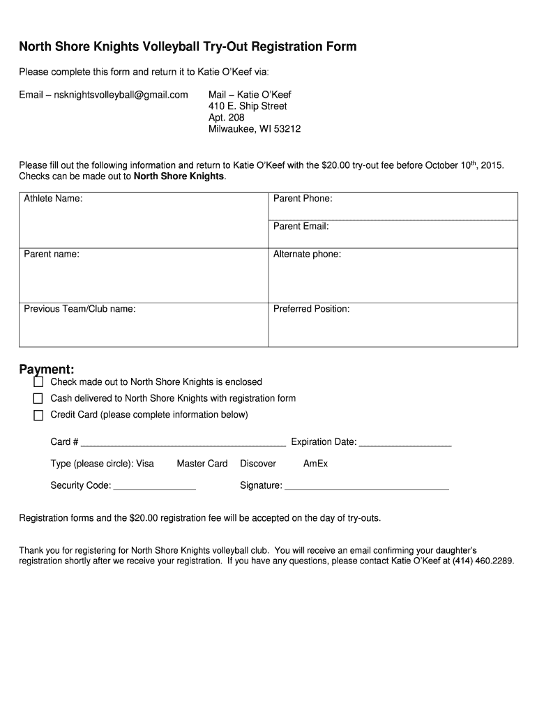 North Shore Knights Volleyball Tryout Registration Form Please complete this form and return it to Katie Keep via: Email nsknightsvolleyball gmail.com Mail Katie Keep 410 E. Ship Street Apt. 208 Milwaukee,