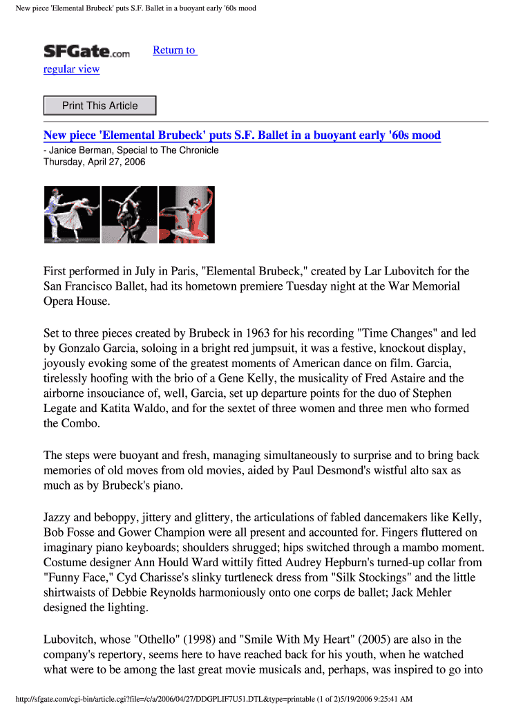 New piece 'Elemental Brubeck puts S.F. Ballet in a buoyant early '60s mood Return to regular view Print This Article New piece 'Elemental Brubeck puts S.F. Ballet in a buoyant early '60s mood Janice