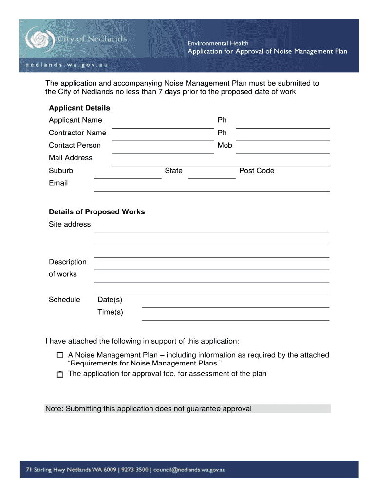 Environmental Health Application for Approval of Noise Management Plan The application and accompanying Noise Management Plan must be submitted to the City of Ned lands no less than 7 days prior to