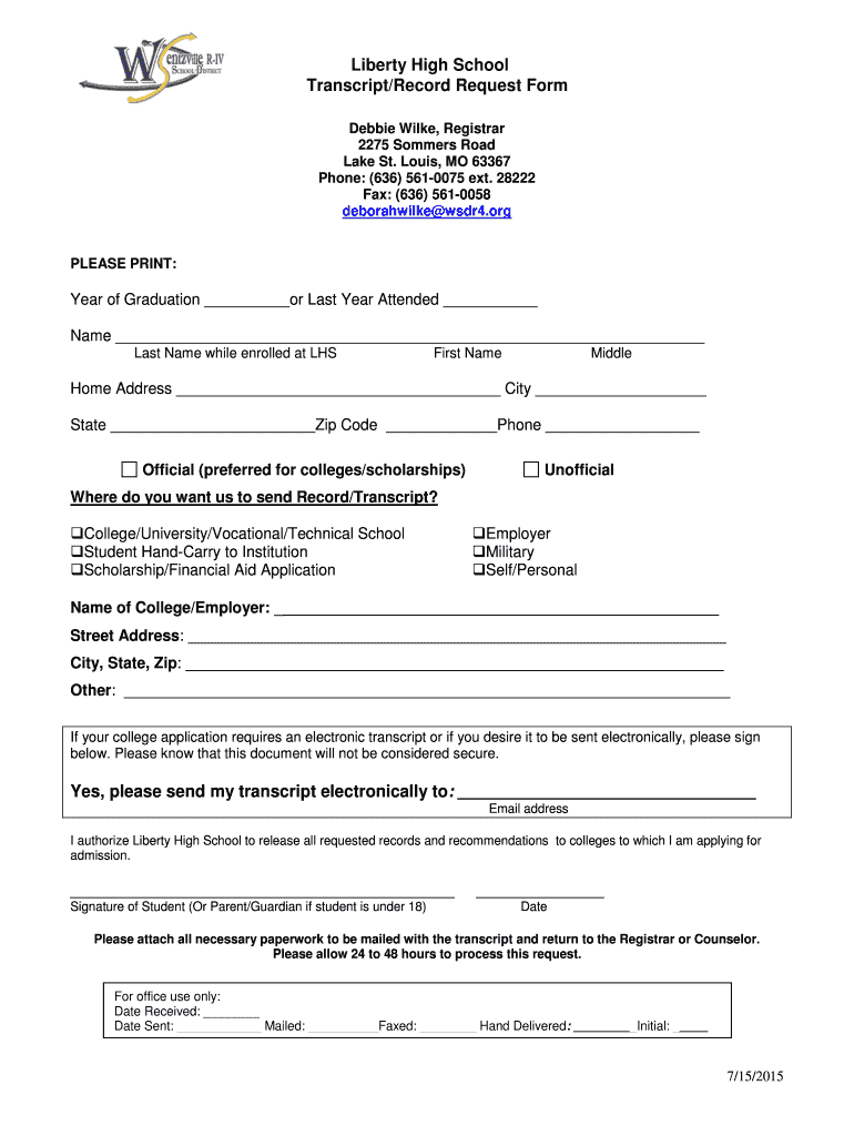 Liberty High School Transcript/Record Request Form Debbie Wilde, Registrar 2275 Summers Road Lake St. Louis, MO 63367 Phone: (636) 5610075 ext. 28222 Fax: (636) 5610058 deborahwilke wsdr4.org PLEASE