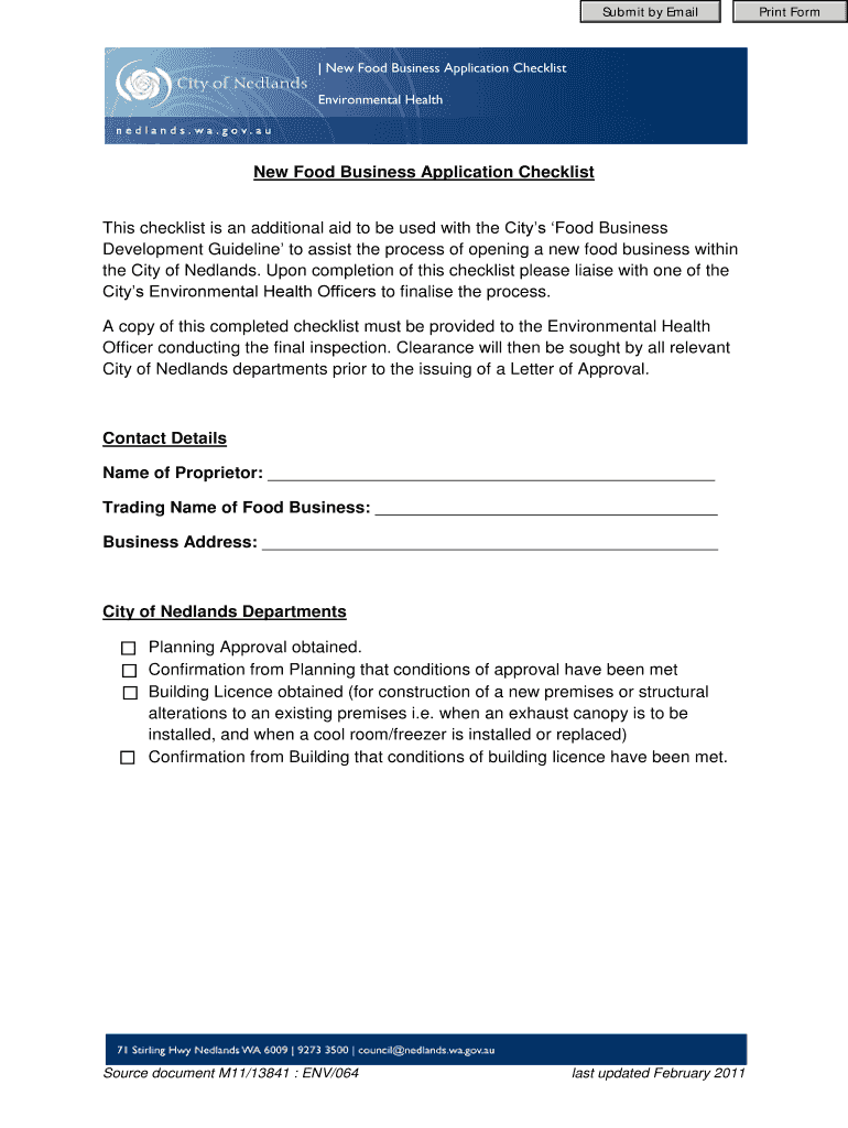 Submit by Email New Food Business Application Checklist Environmental Health New Food Business Application Checklist This checklist is an additional aid to be used with the Cities Food Business Development