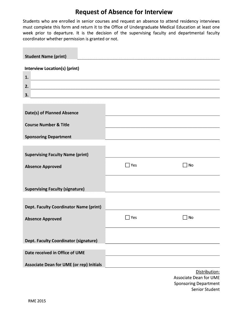 Request of Absence for Interview Students who are enrolled in senior courses and request an absence to attend residency interviews must complete this form and return it to the Office of Undergraduate