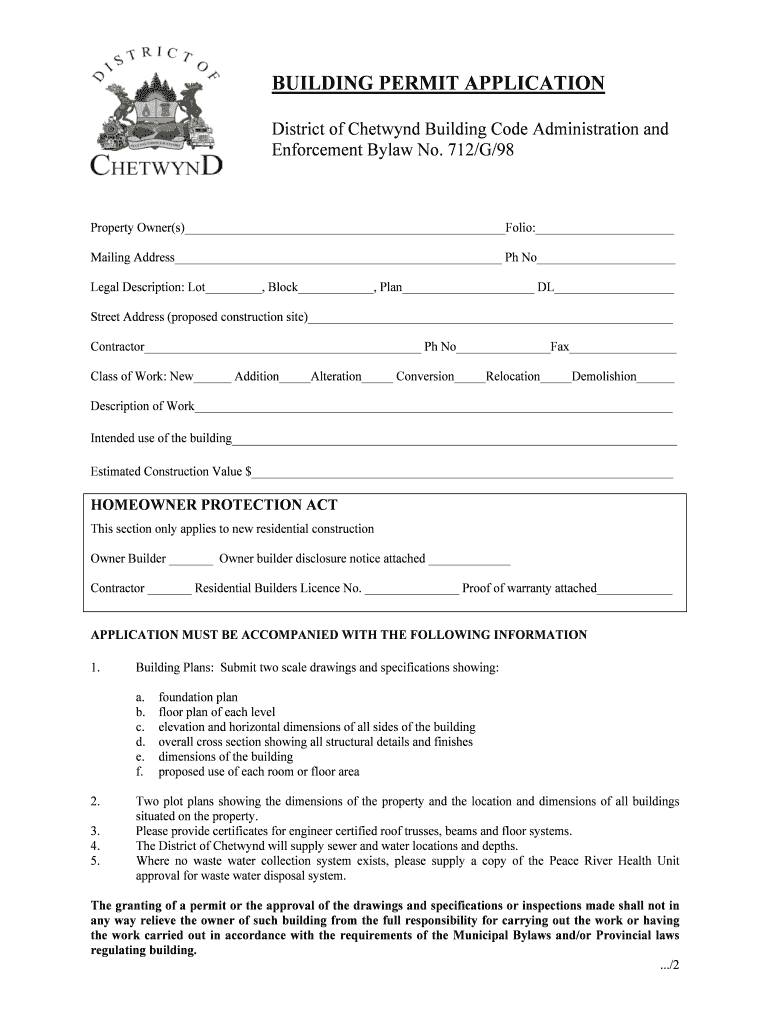 Get the free BUILDING PERMIT APPLICATION - District of Chetwynd