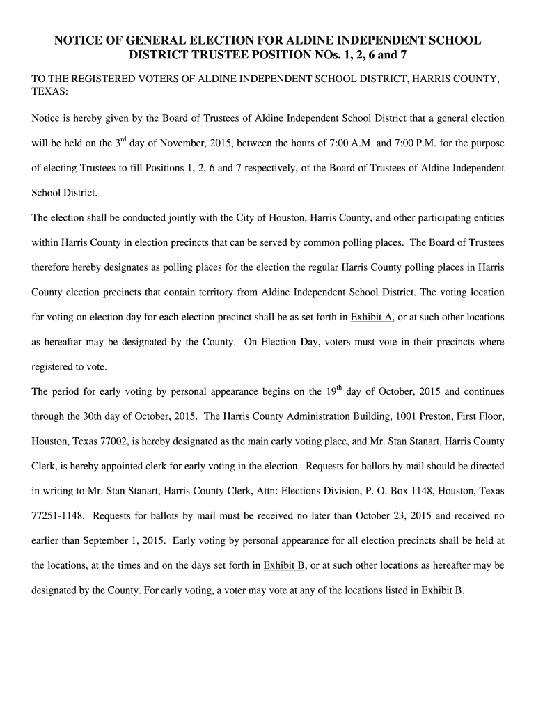 NOTICE OF GENERAL ELECTION FOR ALDINE INDEPENDENT SCHOOL