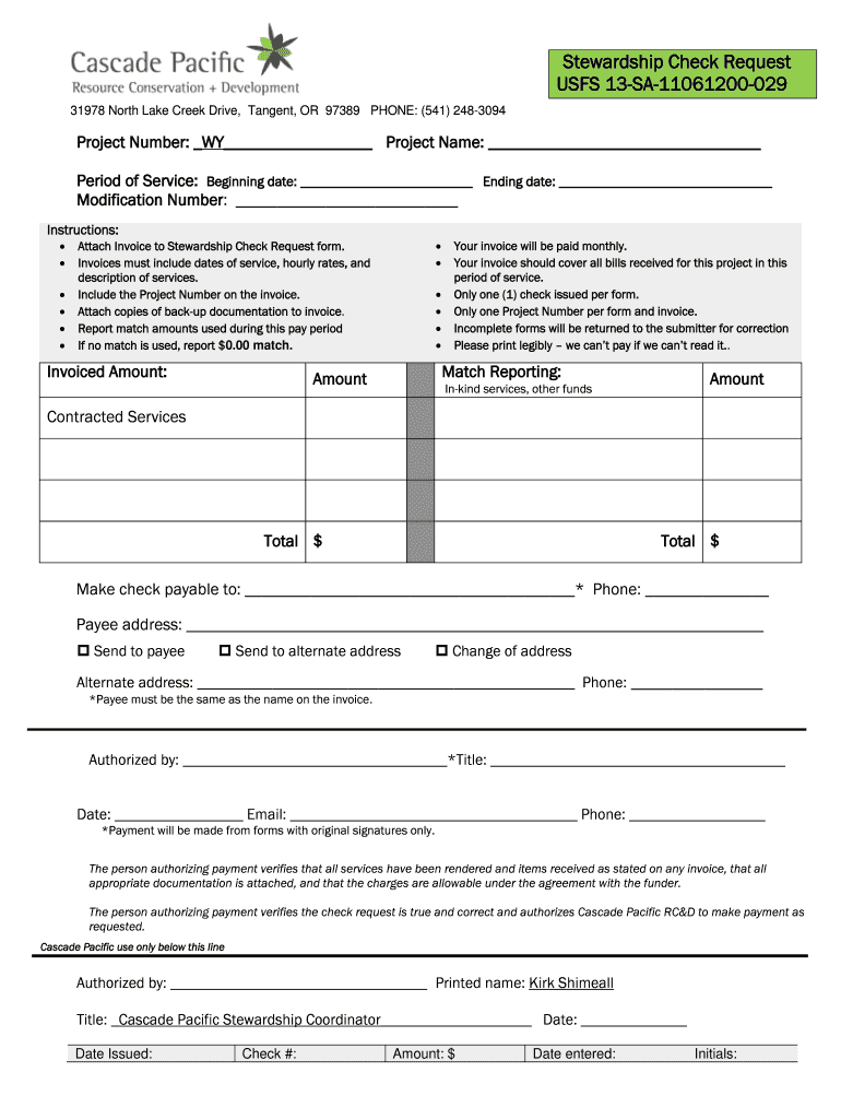 Stewardship Check Request USES 13SA11061200029 31978 North Lake Creek Drive, Tangent, OR 97389 PHONE: (541) 2483094 Project Number: WY Project Name: Period of Service: Beginning date: Ending date: