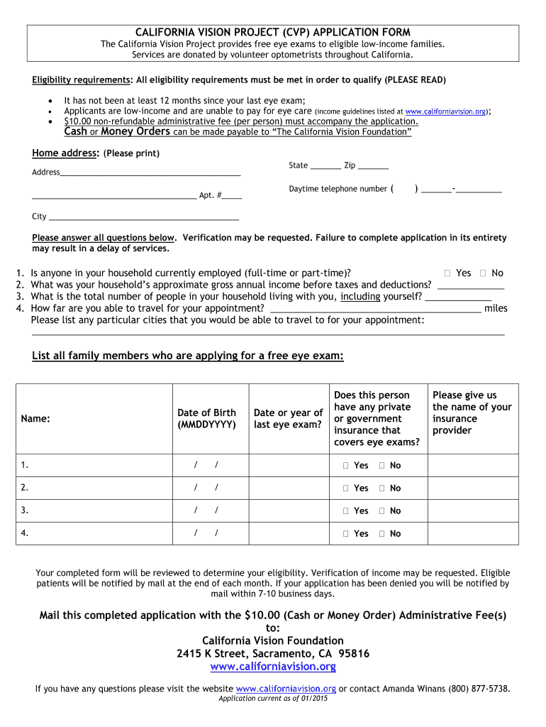 CALIFORNIA VISION PROJECT (CVP) APPLICATION From The California Vision Project provides free eye exams to eligible low-income families. Services are donated by volunteer optometrists throughout California.