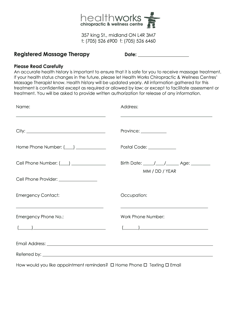 357 king St., midland ON L4R 3M7 t: (705) 526 6900 f: (705) 526 6460 Registered Massage Therapy Date: Please Read Carefully An accurate health history is important to ensure that it is safe for you