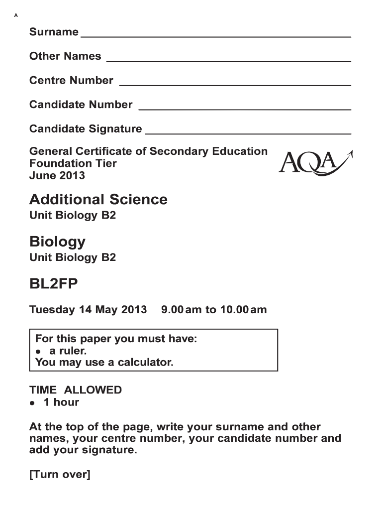 A Surname Other Names Center Number Candidate Signature General Certificate of Secondary Education Foundation Tier June 2013 Additional Science Unit Biology B2 Biology Unit Biology B2 BL2FP Tuesday