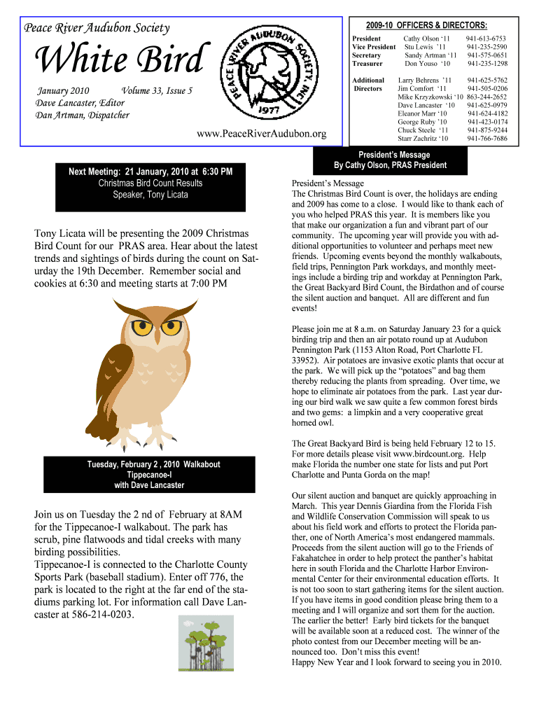 200910 OFFICERS & DIRECTORS: Peace River Audubon Society President Vice President Secretary Treasurer White Bird Additional Directors January 2010 Volume 33, Issue 5 Dave Lancaster, Editor Dan Hartman,