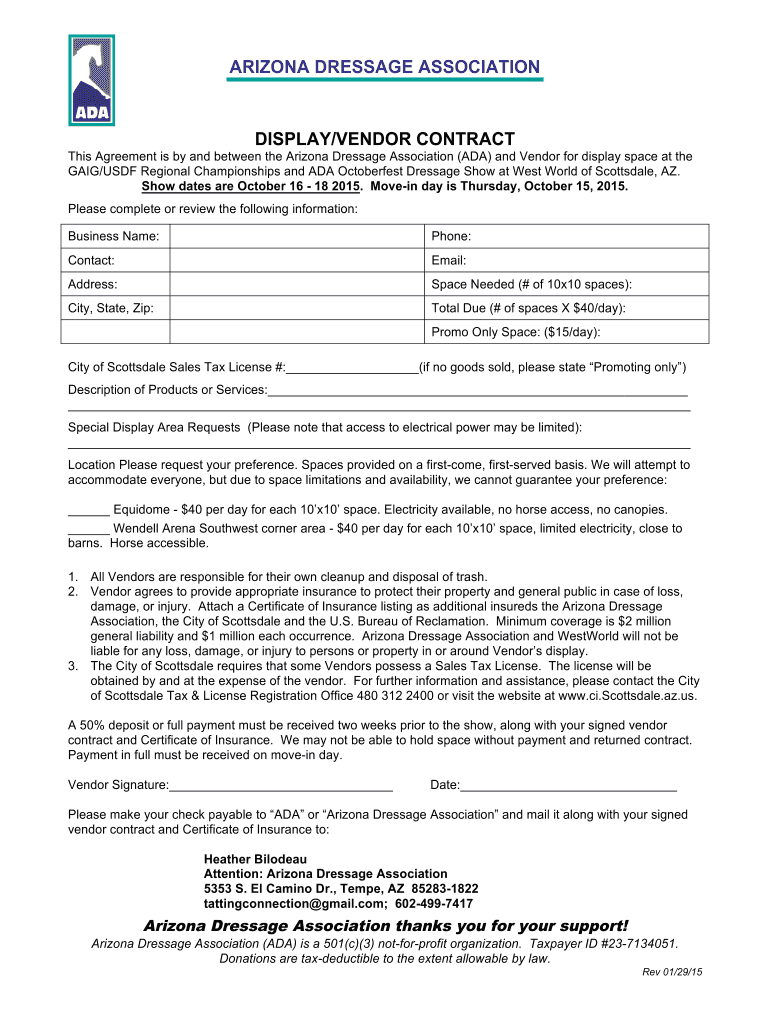 PRINT ARIZONA 'DRESSAGE 'ASSOCIATION ! ! DISPLAY/VENDOR 'CONTRACT This! Agreement!is!by!and!between!the! Arizona! Dressage! Association!(ADA)!and! Vendor!for!display!space!at!the! GAIN/USAF! Regional!