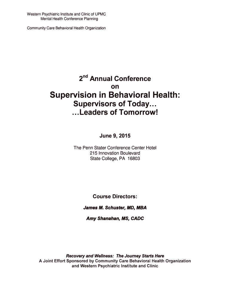 Western Psychiatric Institute and Clinic of UPMC Mental Health Conference Planning Community Care Behavioral Health Organization 2nd Annual Conference on Supervision in Behavioral Health: Supervisors