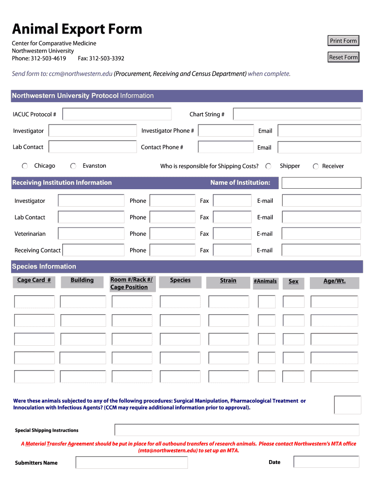 Animal Export Form Print Form Center for Comparative Medicine Northwestern University Phone: 3125034619 Fax: 3125033392 Reset Form Send form to: CCM northwestern.edu (Procurement, Receiving and Census