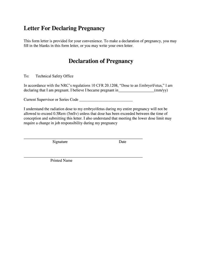 Letter For Declaring Pregnancy This form letter is provided for your convenience. To make a declaration of pregnancy, you may fill in the blanks in this form letter, or you may write your own letter.