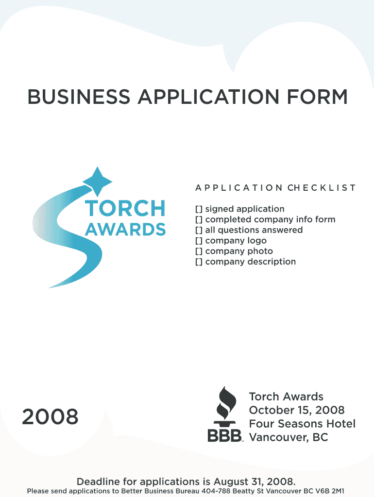 This document is an application form for the inaugural Torch Awards hosted by the Better Business Bureau to encourage businesses demonstrating ethics and integrity.