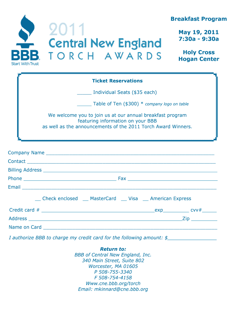 This document is a reservation form for an annual breakfast program hosted by BBB, detailing ticket options, contact information, and payment methods.