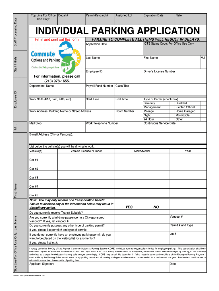 The Individual Parking Application is a business form used by employees of the City of Los Angeles to apply for a parking permit or keycard.